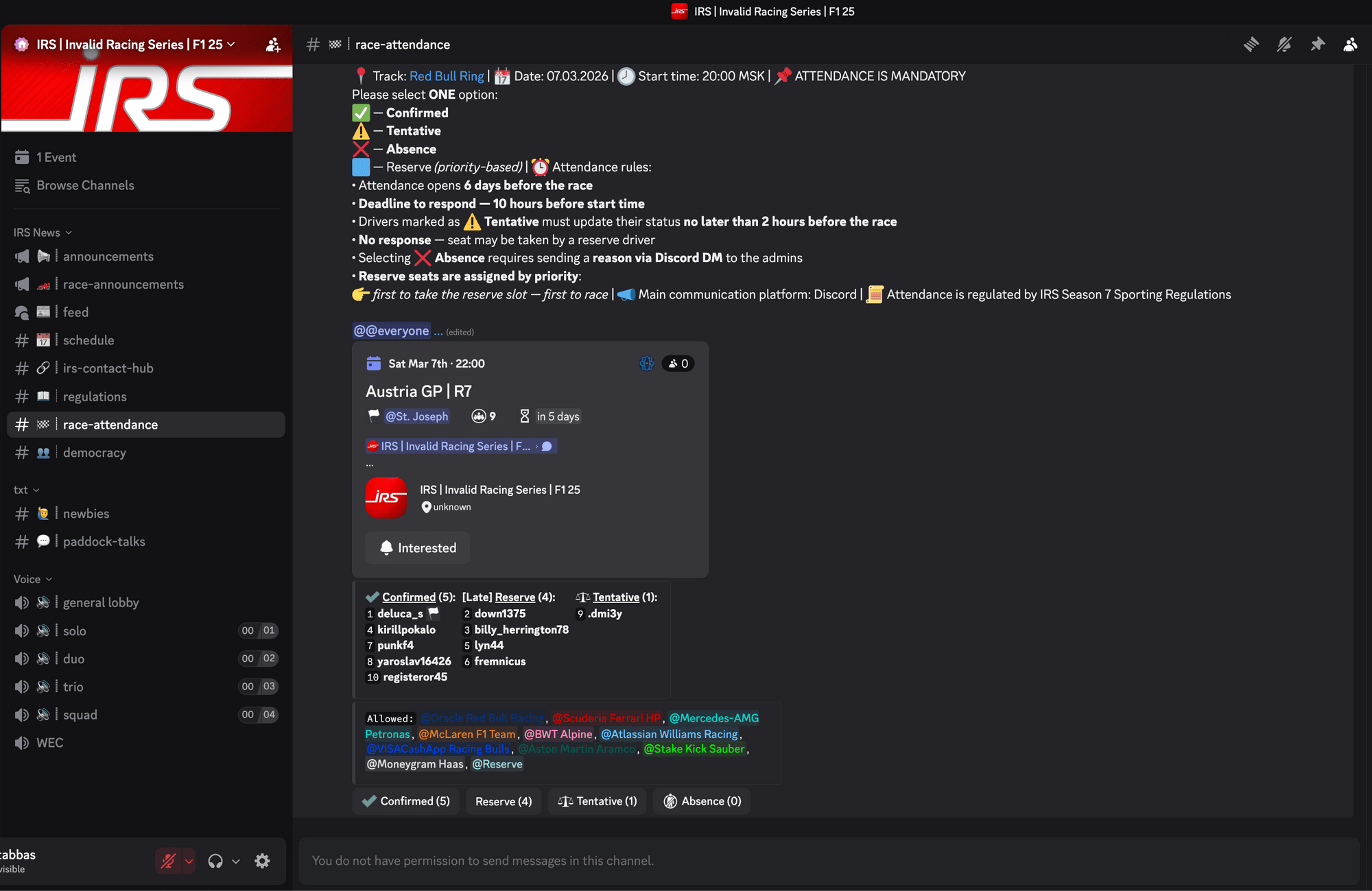 Second, IRS also do not use the custom F1-25 guest template for their events. Guest template allows the admin to know which team each driver and reserve driver belongs to, improving the registration process.