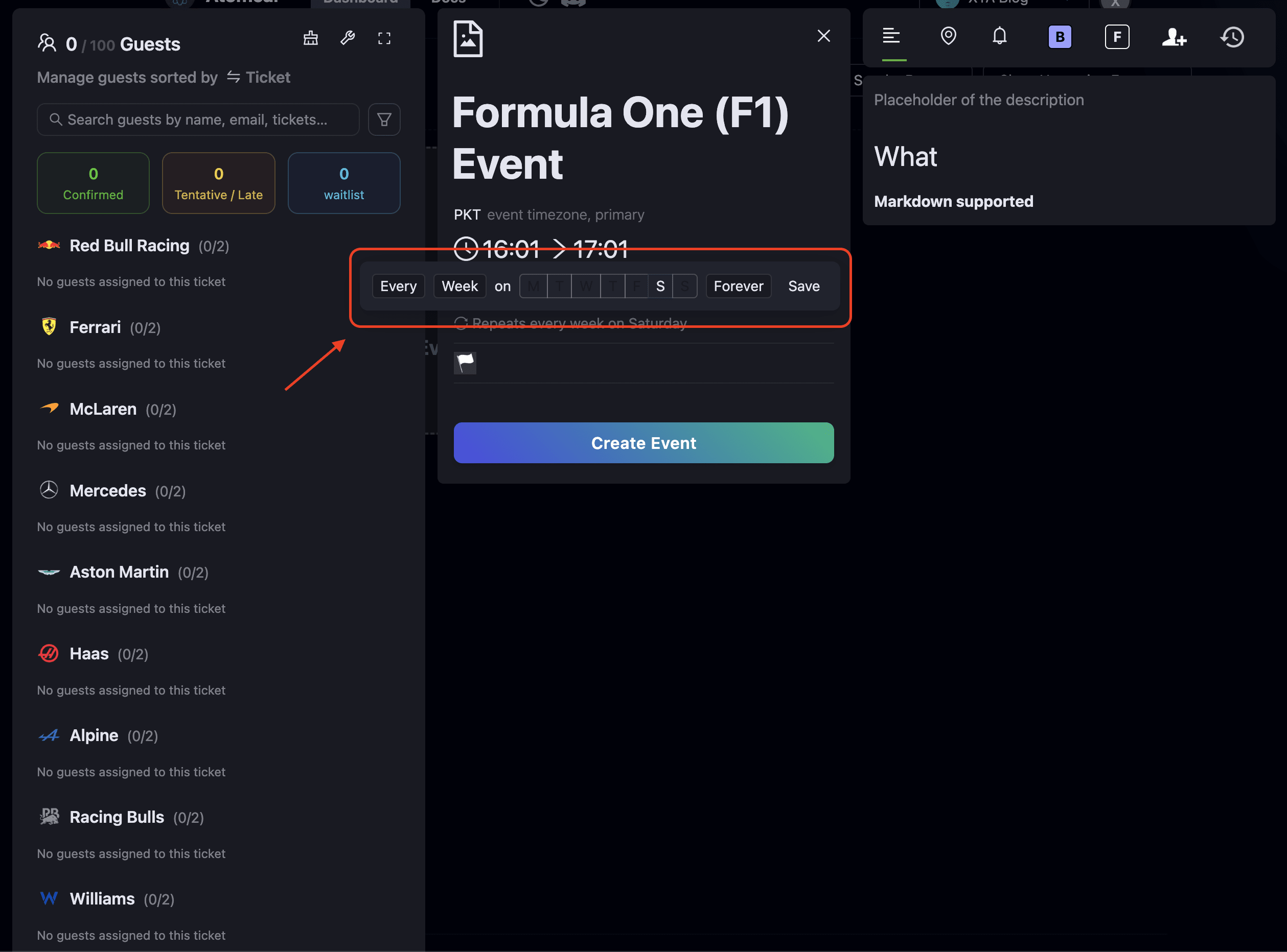 For example, IRS do not use Recurring events feature of Atomcal and manually add each grand prix event individually. With recurring event, the admin can create event once and forget about attendance management completely.